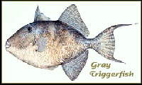 Description: They get their name from the dorsal fins. Unlike most fish, the trigger has only three stiff dorsal spines and they can lock them in an upright position. The only way to get them down is to push down on the third spine. It acts as a "trigger" and the other two spines will flatten into a groove in the fishes back. Their teeth can crack open a crab shell. Their eyes are set far back from the mouth. The skin of a trigger fish is just like that of the file fish. I've been told that it was used as sandpaper in colonial days.